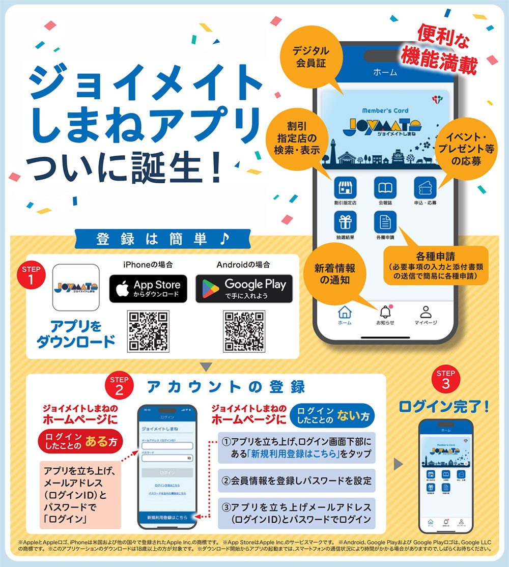 ジョイメイトしまねのアプリができました。下記の手順に従ってダウンロードし、ぜひご活用ください。